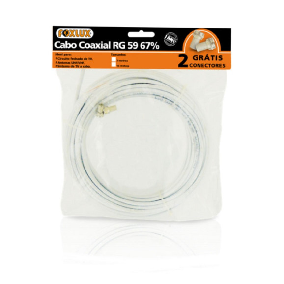 O Cabo Coaxial RG59 de 7 metros da Foxlux é ideal para instalações de antenas (individuais ou coletivas) - VHF,UHF e parabólicas - e em sistemas de câmeras de vigilância por TV (CFTV). Acompanha dois conectores tipo rosca para facilitar ainda mais o uso do produto.