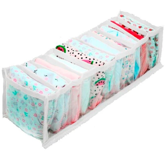 A colmeia organizadora para roupas de bebes possui 6(seis) divisórias e tem a seguinte medida: 10 x 10 x 35cm