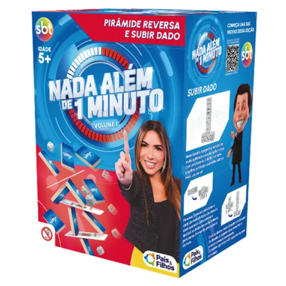 Pirâmide Reversa e Subir Dado - Conheça a coleção completa dos jogos Nada Além de 1 Minuto. Cada caixa conta com 2 jogos para se divertir em casa! Neste jogo você encontra: 1) Pirâmide Reversa: neste desafio, o jogador deve montar uma pirâmide reversa utilizando blocos e cartas. O primeiro passo é posicionar 1 bloco em pé como base e colocar 2 cartas em cima. 2) Subir Dado: neste desafio, o jogador precisará de muita agilidade e coordenação motora. Com uma base de 3 dados, ele deve empilhar os 4 dados que estão sobre a mesa, um por um.