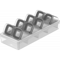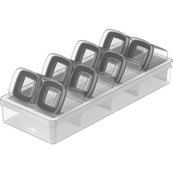 O Kit de organização de temperos para gaveta Clear da Ou contém: 8 potes Block Mini de 150ml e 1 organizador de gavetas.