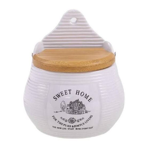 Saleiro para parede de cerâmica com tampa em madeira com as medidas: 10 x 7,5 x 13cm!