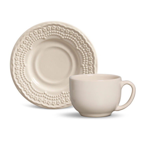 Xícara de chá com pires madeleine cru Porto Brasil.